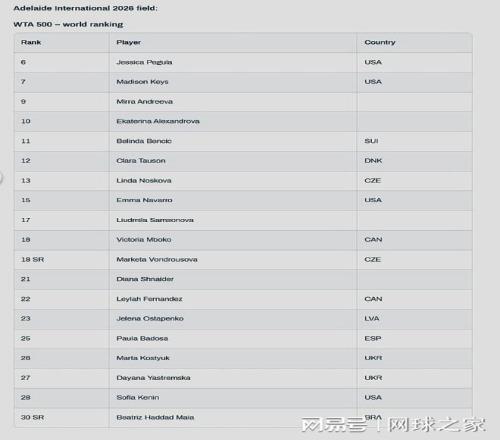 北京时间昨晚,将于2026赛季第二周开打的WTA500阿德莱德站公布了参赛阵容。美国名将佩古拉领衔出战,卫冕冠军凯斯也将开启卫冕之旅;其他参赛的球员还有米拉-安德列娃、亚历山德洛娃、本西奇、陶森、诺斯科娃、纳瓦罗等人。这项赛事将于明年1月12日--17日进行。