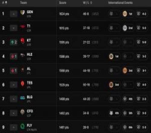 电竞体育11月02报道 lolesports官网更新最新一期的全球战队实力排行榜,具体如下?